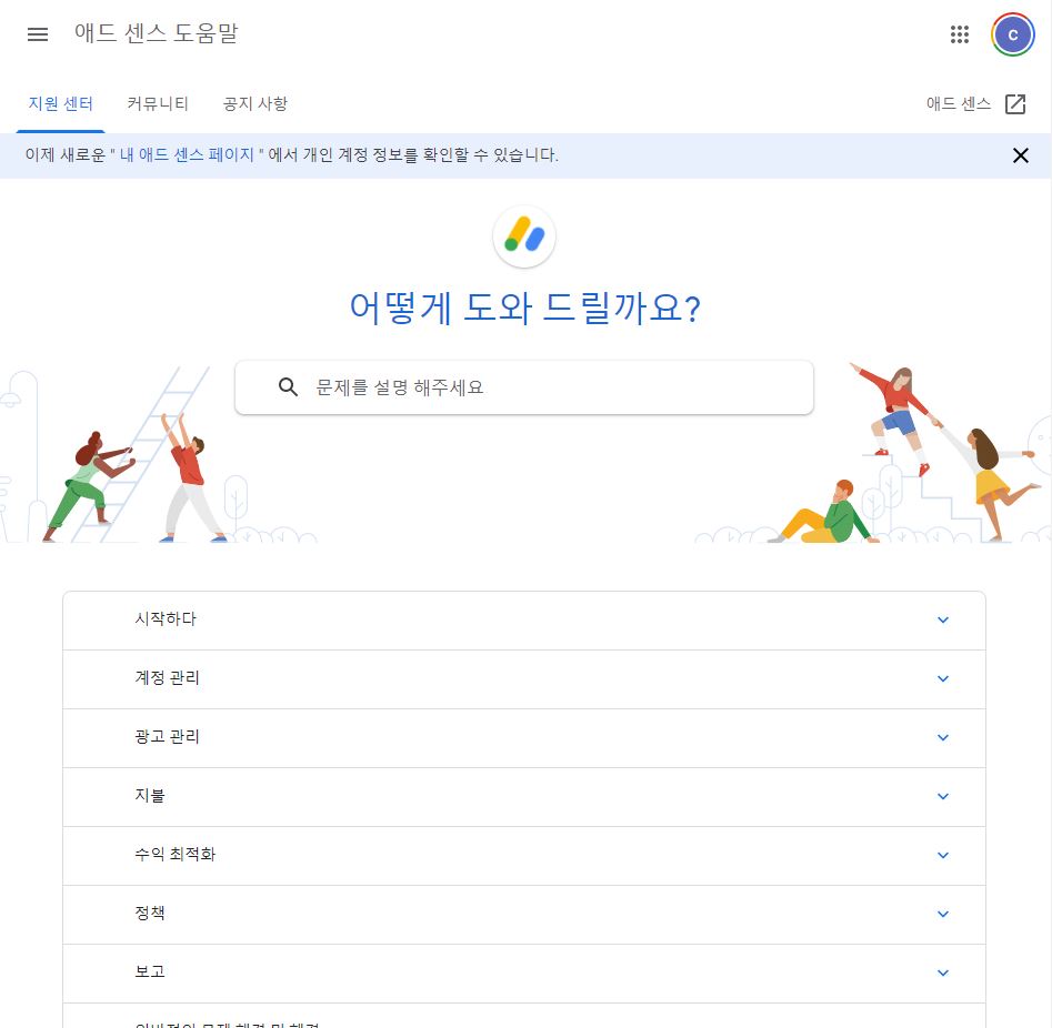 먼저 시작하기를 통해서 애드 센스에 관한 간단한 입문 정보를 알 수 있습니다.