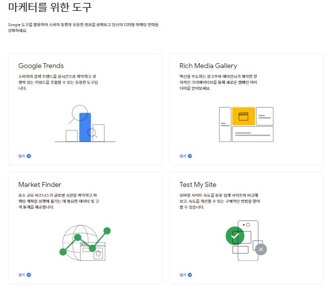 사이트 상단 메뉴 중 '마케터를 위한 도구'를 클릭하시면, 4가지의 도구가 나오게 됩니다.